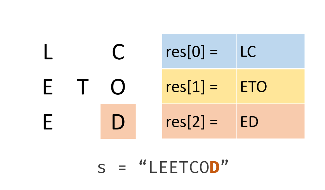 E D H N之后,你的输出需要从左往右逐行读取,产生出一个新的字符串,比如:”LCIRETOESIIGEDHN”。