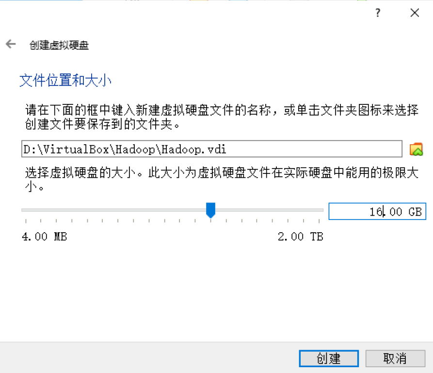 设置虚拟硬盘位置和大小:根据配置,设置大小