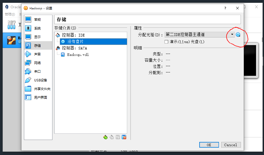1.在VirtualBox管理器中选择刚刚创建的Hadoop虚拟机